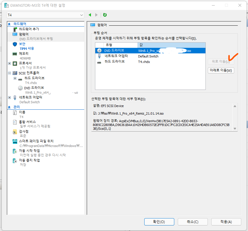 펌웨어를 클릭해서 DVD 드라이브를 맨 위로 이동시켜주고 저장합니다.
