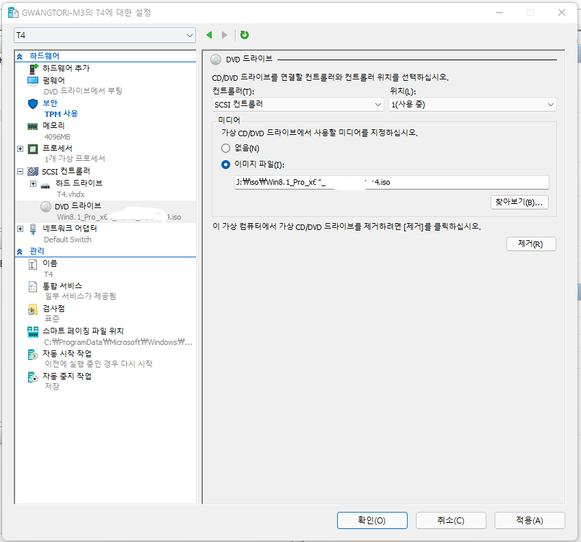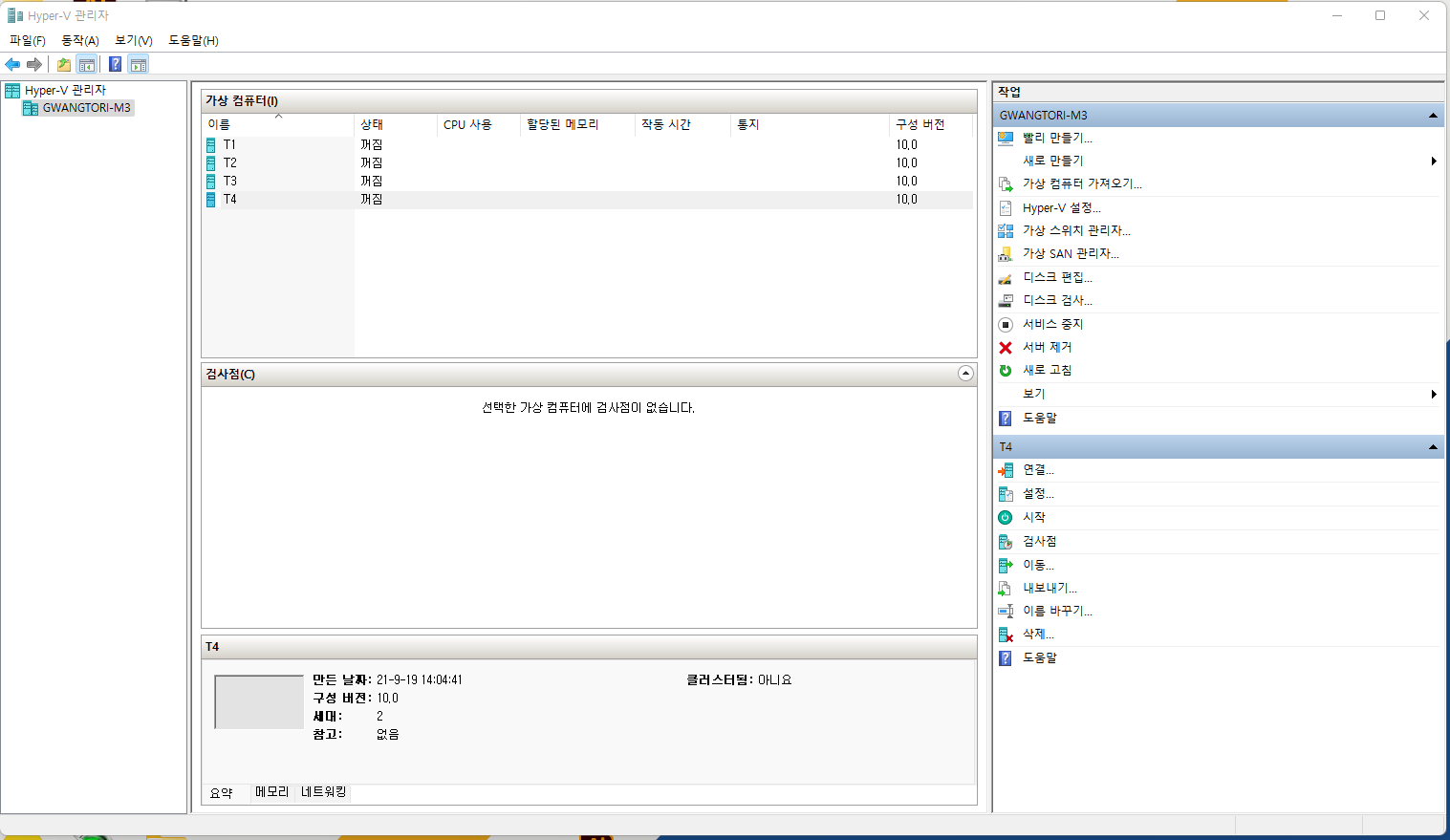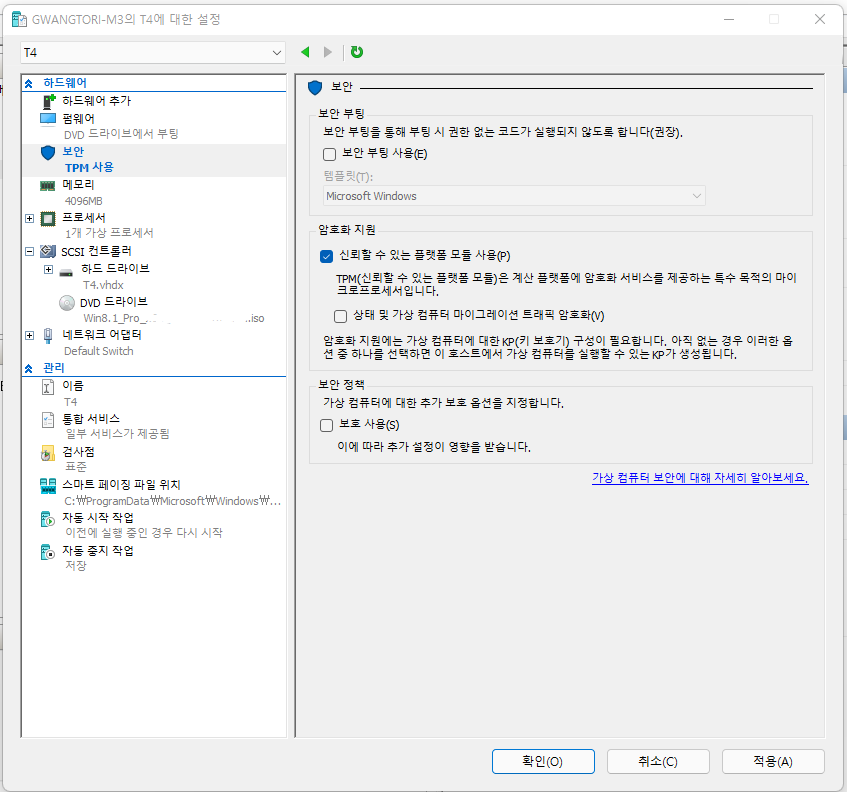 가상 컴퓨터 이름(저 같은 경우는 T4) 아래에 설정을 눌러줍니다.