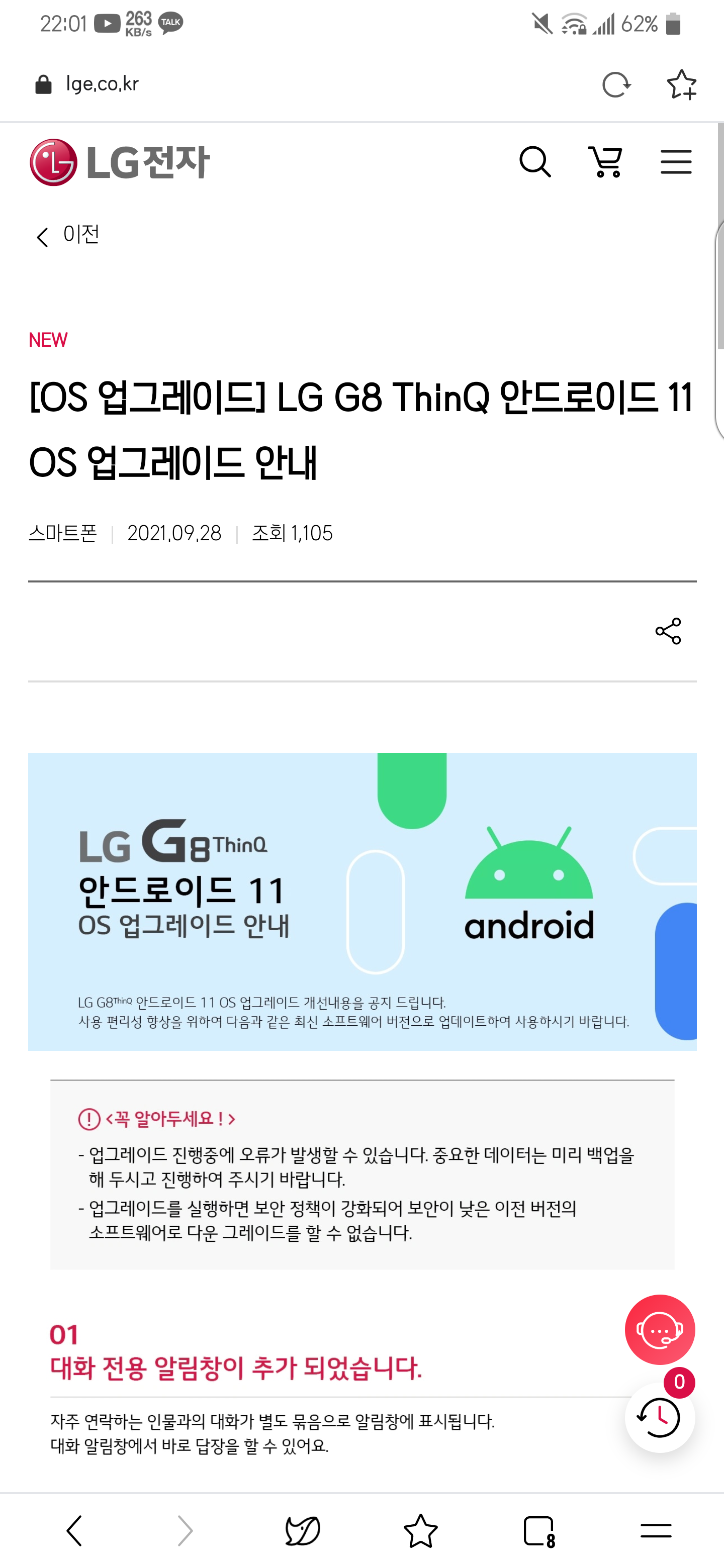 참 의문인 것은 해외에는 V50이 먼저 안드로이드 11 업데이트가 이루워졌는데요, 국내에서는 G8을 먼저 업데이트 시켜줬습니다. 뭐 어쨌든 업데이트가 있는 것은 좋은 일이죠 ㅎㅎ