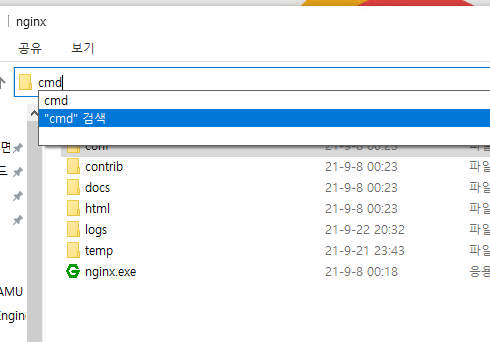 Nginx 폴더에서 cmd를 켜 줍니다. 간단하게 주소 창에 cmd라고 쳐도 됩니다.