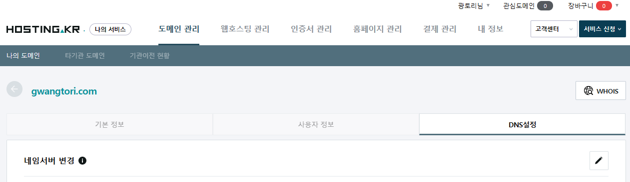 전 도메인 가격이 쫌 저렴한 호스팅케이알 기준으로 설명드리려고 해요.