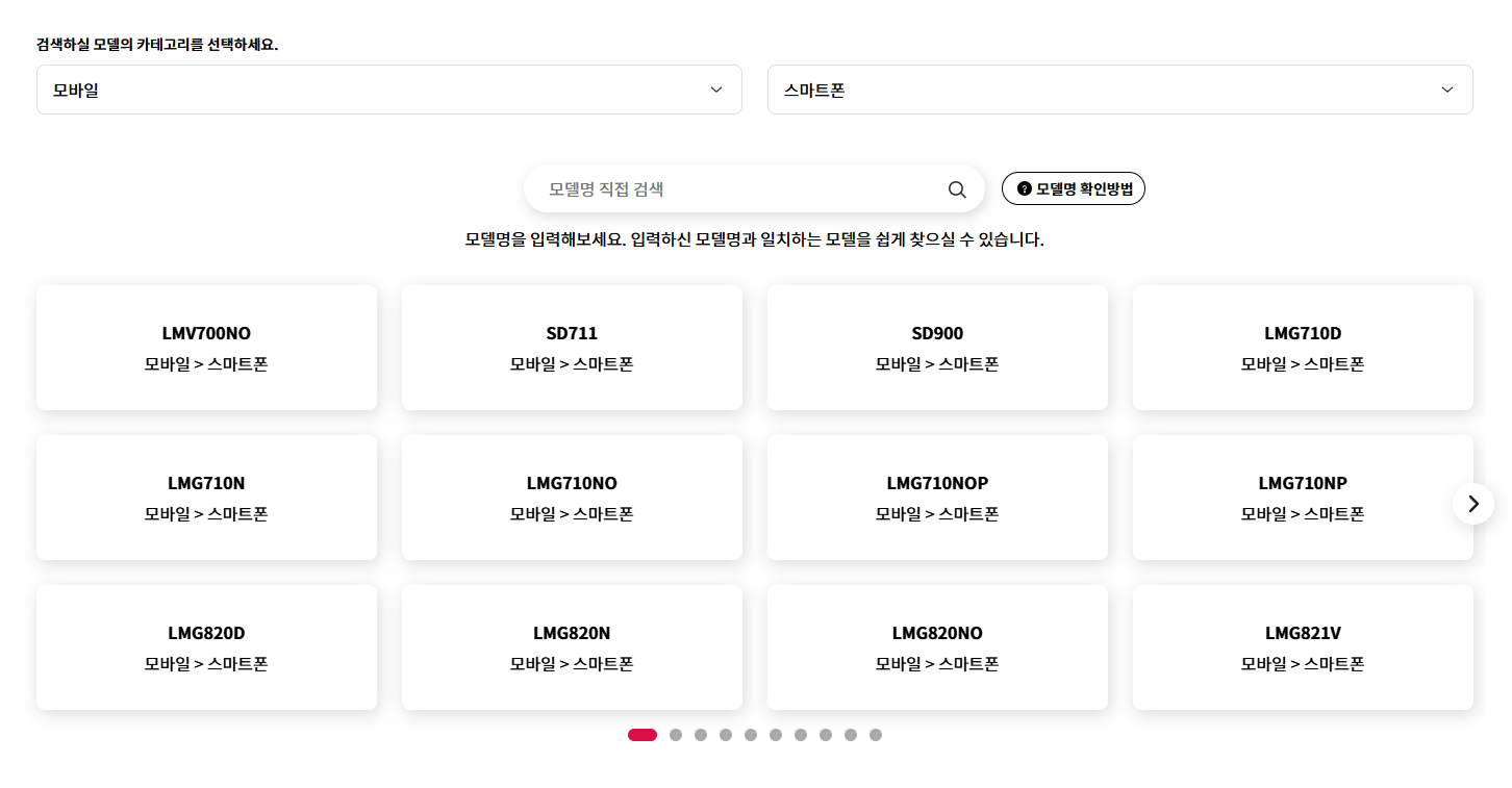 - 업데이트를 할 스마트폰의 모델명을 클릭해 주시고 아래 내리면 드라이버/SW 페이지가 있습니다.