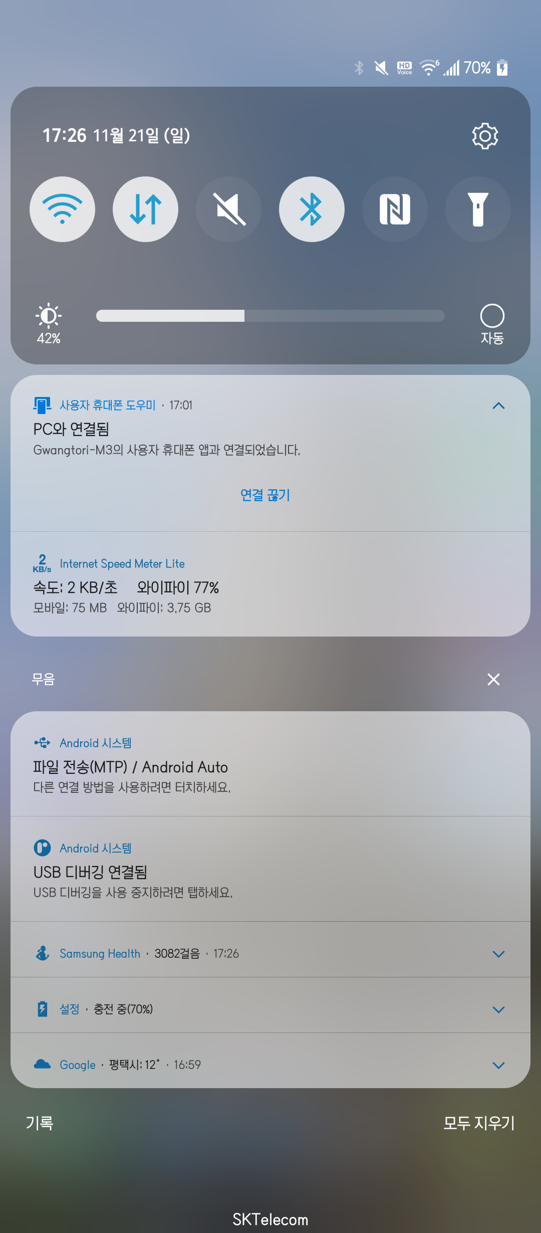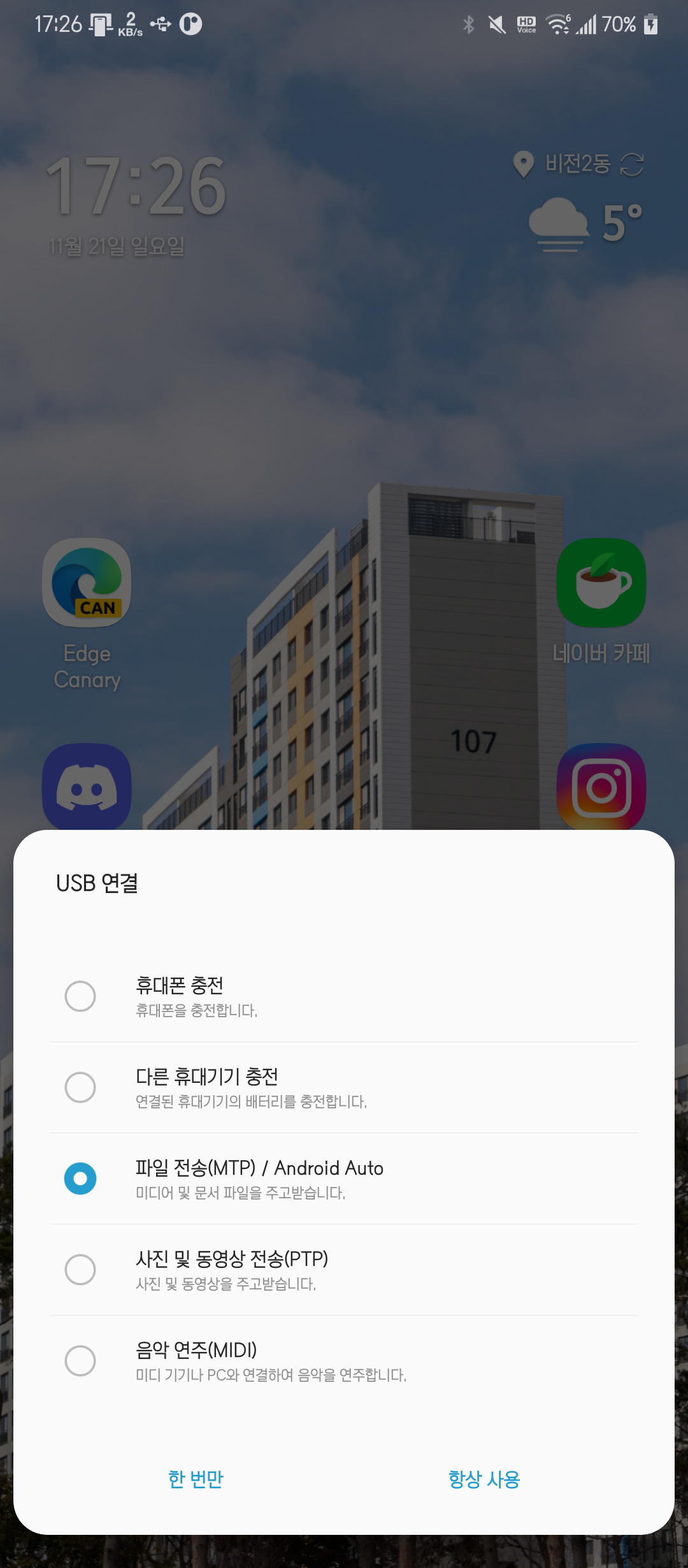 그다음, 충전 케이블을 이용하여 PC와 연결해 주시고, 모드는 파일 전송으로 변경해 주세요.