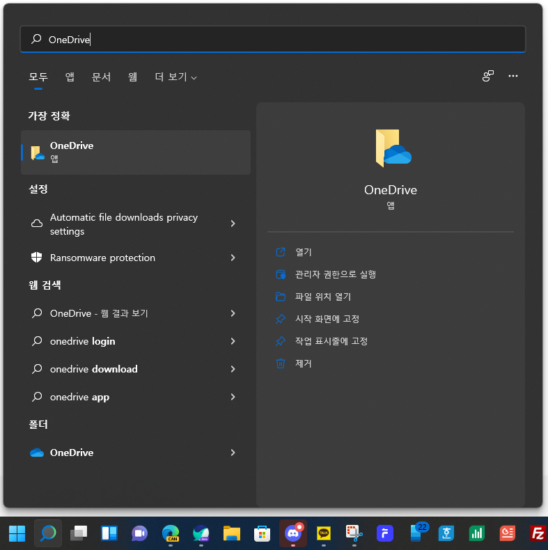 1. 시작 버튼 오른쪽에 있는 검색 버튼을 이용해서 OneDrive를 실행해 줍니다.