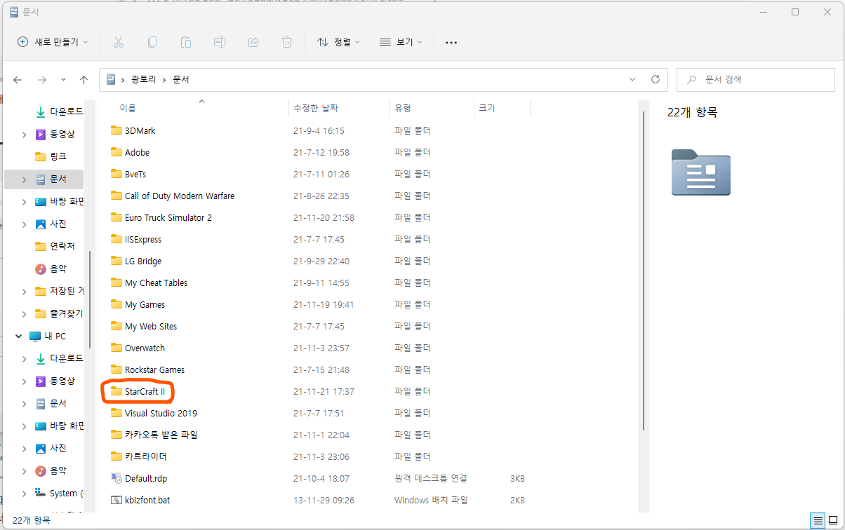 6. 이번에는 문서 폴더 안에 있는 스타크래프트 2 폴더를 삭제시켜 주세요.