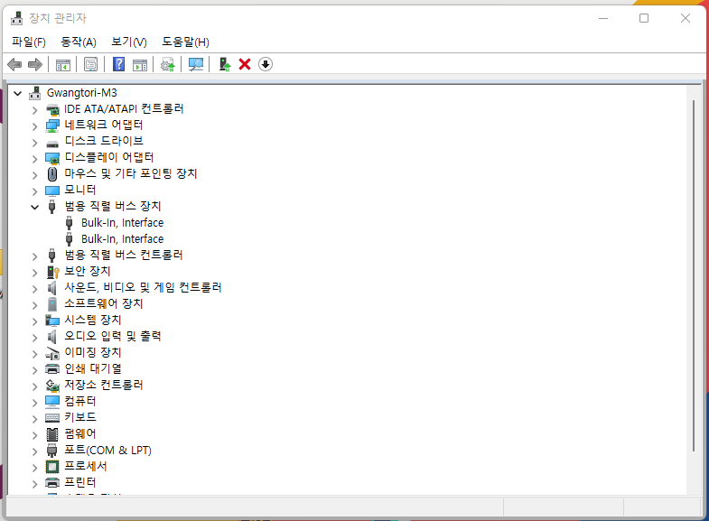 장치 관리자에서 범용 직렬 버스 장치로 표시된다면 성공입니다! 안되신다면 'Bulk-In, Interface (Interface 0)'을 선택해 보세요.