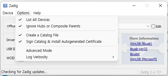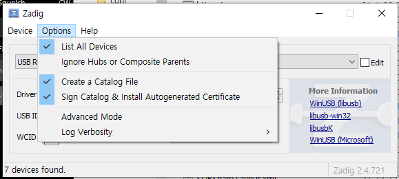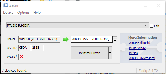 그럼 없었던 zadig 프로그램이 다운로드되었을 겁니다. 실행해 주세요.