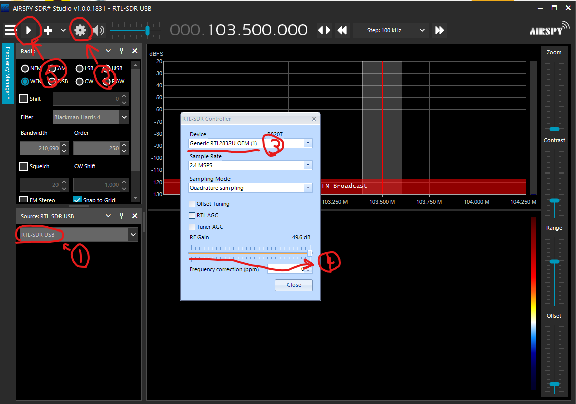 4. RF Gain을 적당히 올려줍니다. (-70dB 정도를 맞추면 좋다고 합니다.)