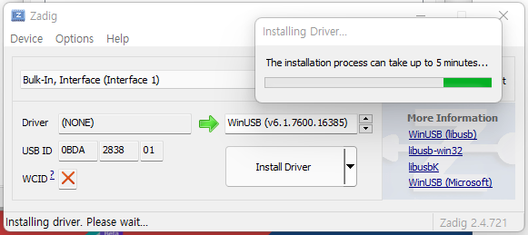 'Bulk-In, Interface (Interface 1)'을 선택하고 Install Driver를 눌러주세요.