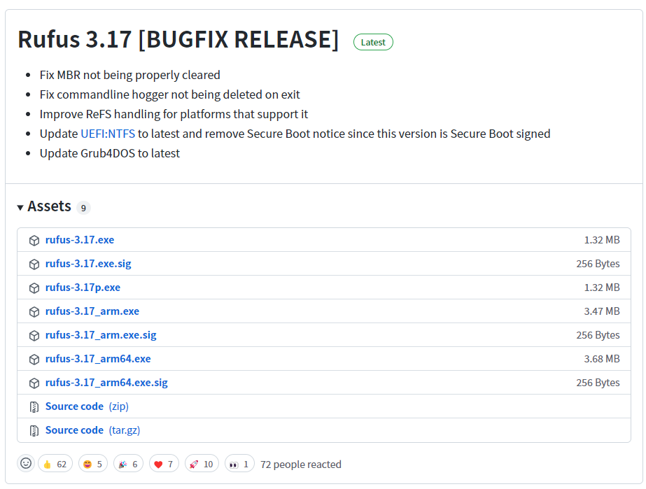 - 자신에게 맞는 것을 눌러서 다운로드해줍니다. 보통의 Windows PC는 가장 첫번째 것(rufus-3.17.exe)을 설치해주시면 됩니다.