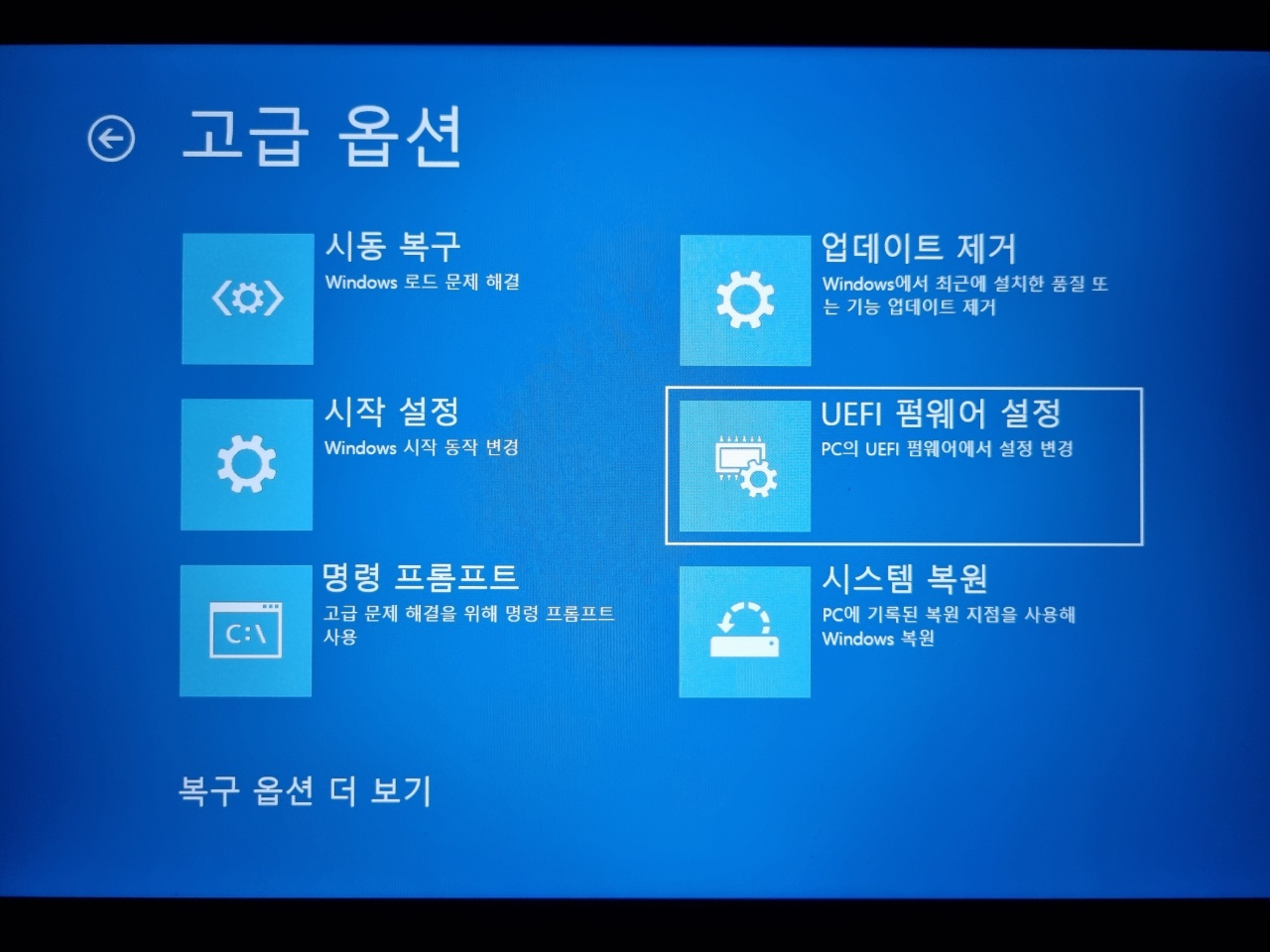 - 문제 해결 > 고급 옵션 > UEFI 펌웨어 설정으로 이동합니다.