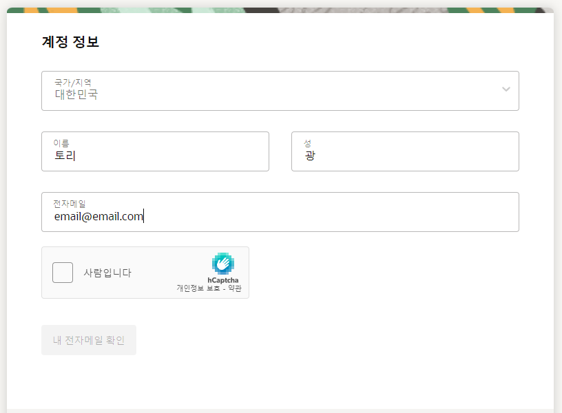 - 국가는 대한민국으로 정해주고, 이름, 이메일을 써준 후 캡차를 통과하고 내 전자메일 확인을 눌러줍니다.