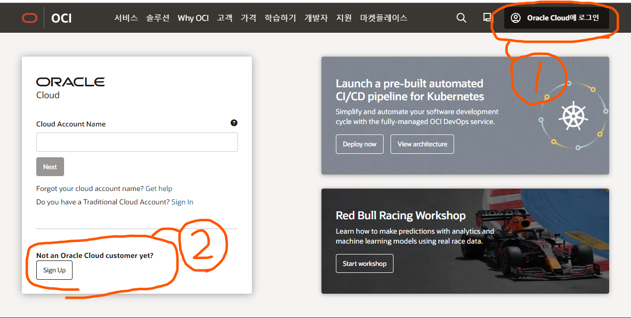 오라클 클라우드 홈페이지에 들어가서 가입을 해 봅시다. https://www.oracle.com/kr/cloud/