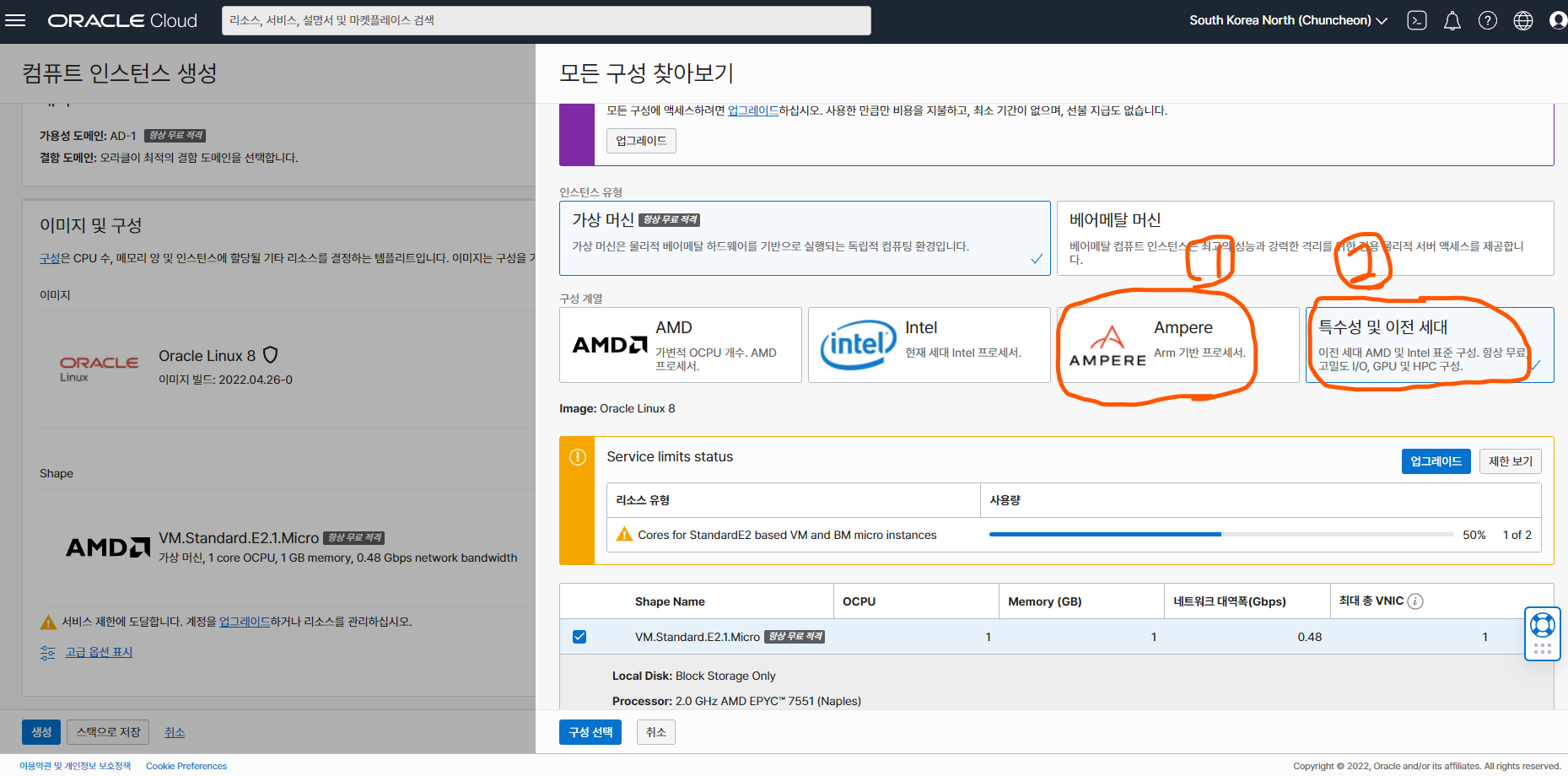 1번은 ARM인데 4코어 24기가 램까지 무료고, 특수성 및 이전 세대는 x84, 64인 대신 1코어 1기가 램까지 무료입니다. 용도를 잘 고민하시고 결정하시는 것을 추천드립니다.