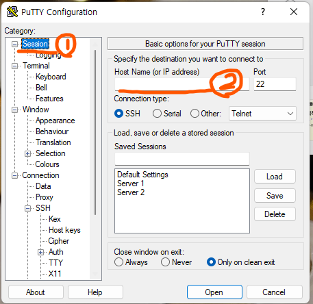 - 호스트에는 IP, 포트는 22로 설정합니다.