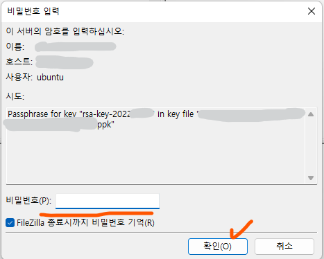 - 키 파일을 만들 때 설정한 비밀번호를 입력하고 확인을 눌러서 연결하면 성공합니다.