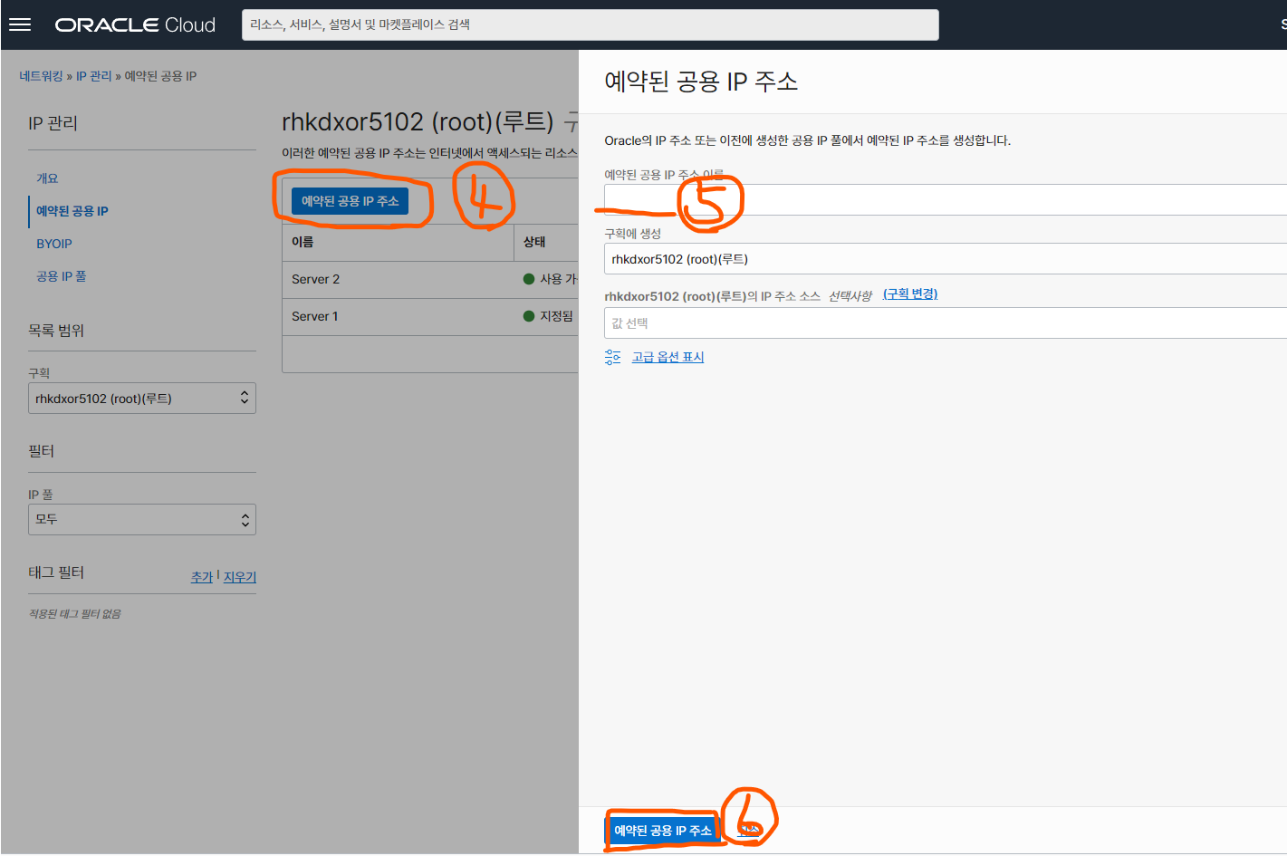 순서대로 이동한 후, 알아보기 쉬운 이름으로 설정해 주시고 '예약된 공용 IP 주소'를 눌러주세요.
