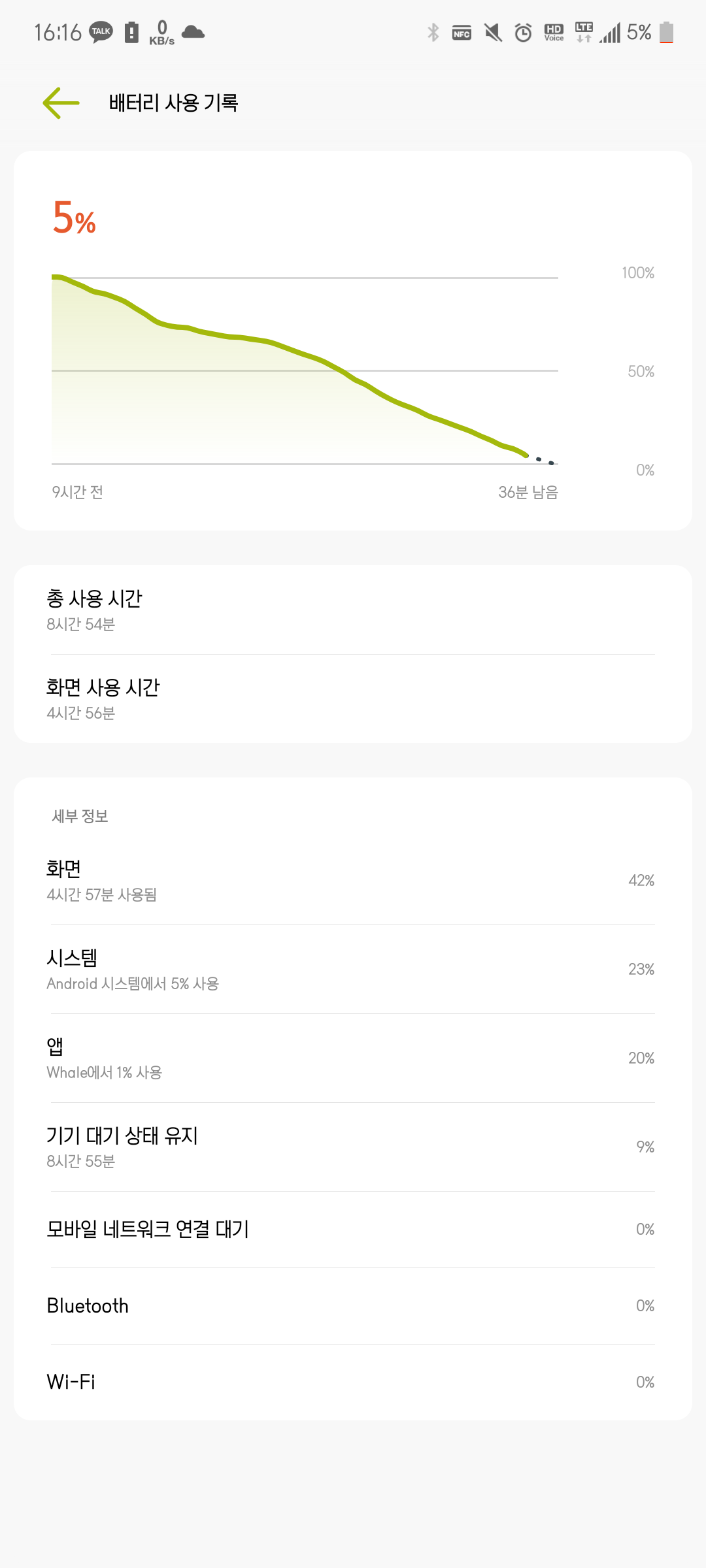 • 저의 사용 패턴은 흰 화면이 많은 웹 서핑과 카카오톡, 유튜브에 가끔 블루투스 이어폰으로 음악 듣기 정도의 패턴입니다.