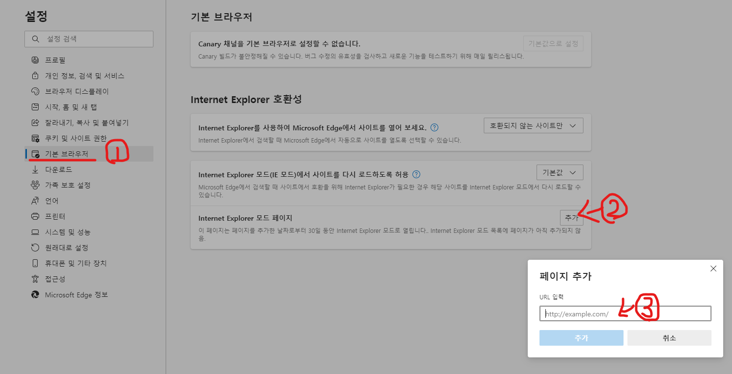 - ... → 설정 → 기본 브라우저 → Internet Explorer 모드 페이지 > 추가 → 익스플로러 모드로 열 페이지의 URL 입력