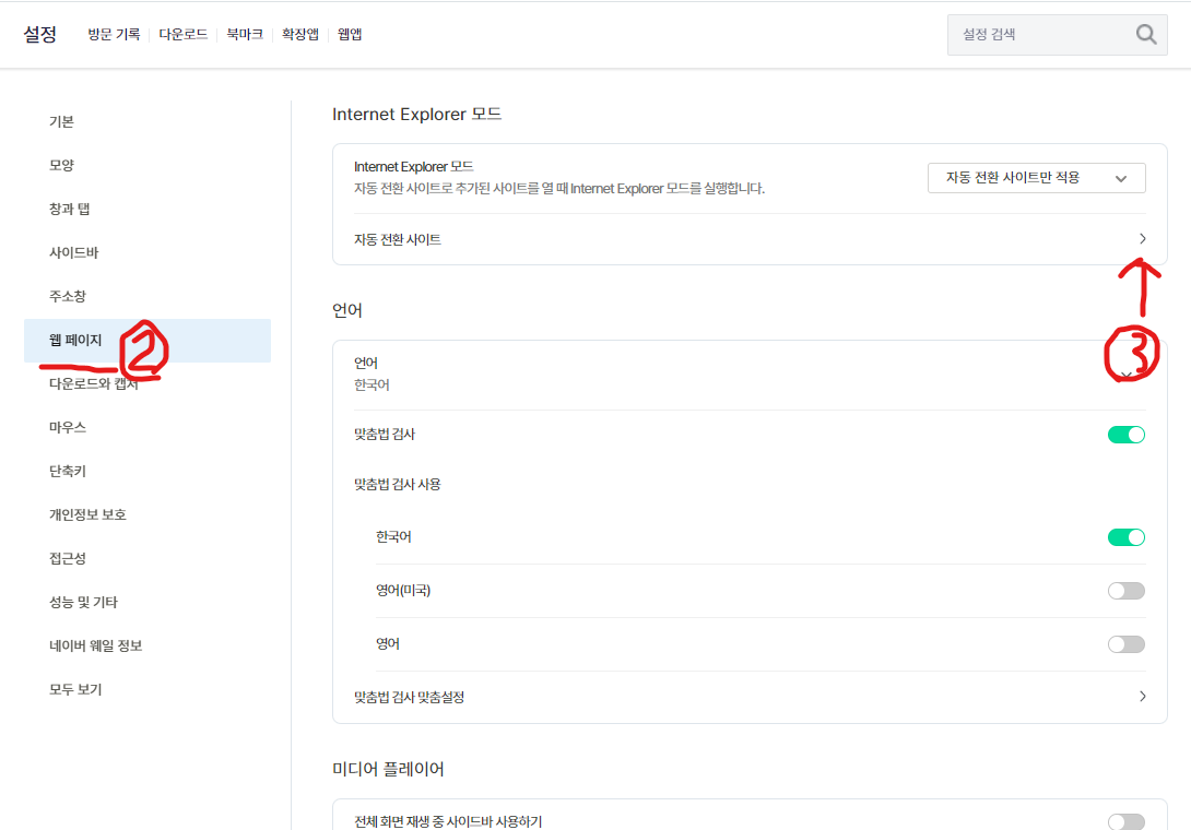 - ... → 설정 → 웹 페이지 → 자동 전환 사이트로 이동합니다.