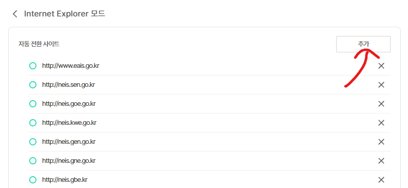 - ... → 설정 → 기본 브라우저 → Internet Explorer 모드 페이지 > 추가 → 익스플로러 모드로 열 페이지의 URL 입력