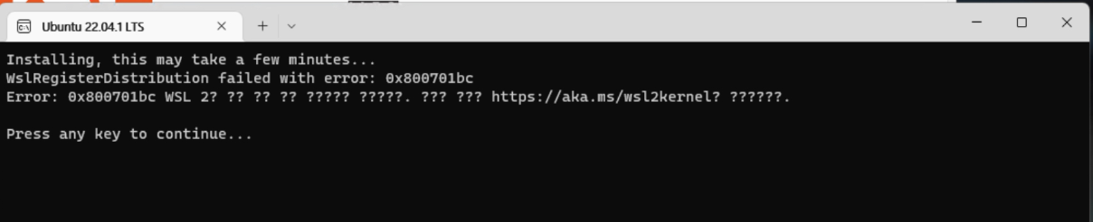 켜졌는데 다음과 같은 오류가 발생한다면, https://aka.ms/wsl2kernel 에 들어가셔서 최신 패키지를 다운로드해주세요.