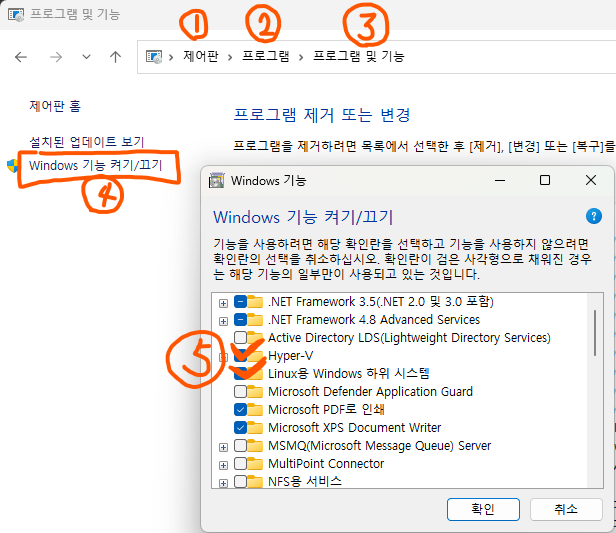 - Hyper-V와 Linux용 Windows 하위 시스템을 활성화해주시고, 확인을 눌러 주세요.