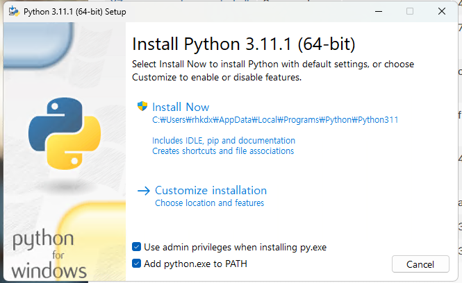 3. Add python.exe to PATH를 체크하고 Install Now를 눌러 설치합니다.