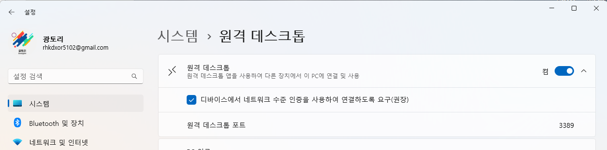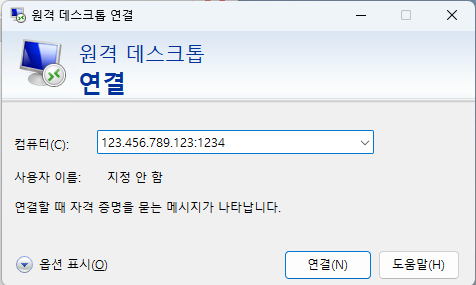 - 연결 탭에 IP를 입력하고 뒤에 포트를 써주세요. 3389일 경우 안 하셔도 됩니다. IP는 네이버에 '내 ip' 검색하면 나오는 IP를 말합니다.