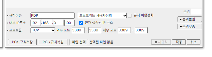 - 외부 포트: 기본 값은 3389이지만, 보안을 위해 다른 포트로 변경하실 것을 추천드립니다.