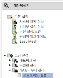 - 메뉴탐색기에서 '고급 설정 → NAT/라우터 관리 → 포트포워드 설정'으로 이동