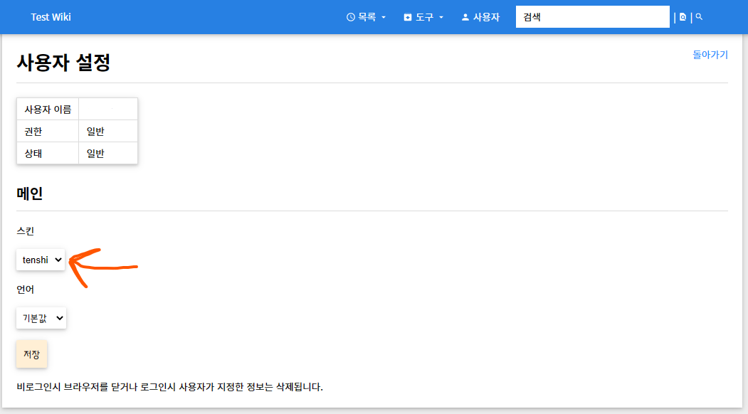 이제 우리가 만든 위키의 기본 스킨으로 설정해볼까요?