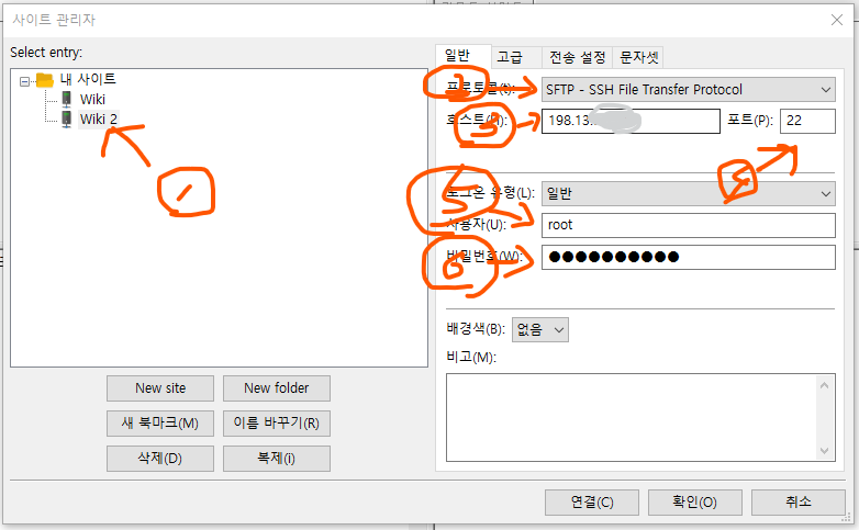 2번(프로토콜)을 SFTP로 바꿔줍니다. Vultr는 SFTP를 추천하기 때문에 SFTP로 바꿔줍니다.