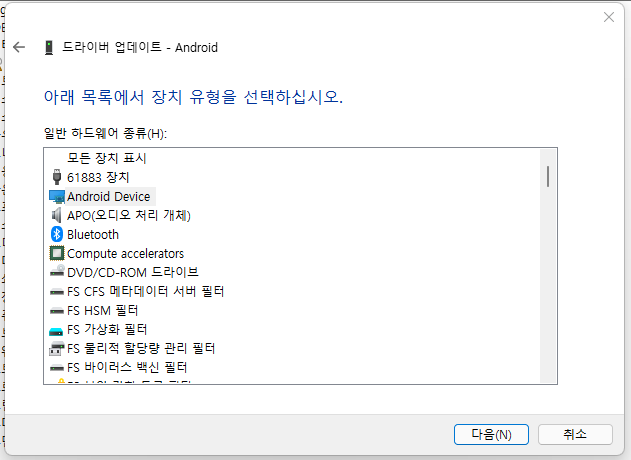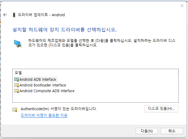 Android ADB Interface를 선택하고 다음을 눌러주세요.