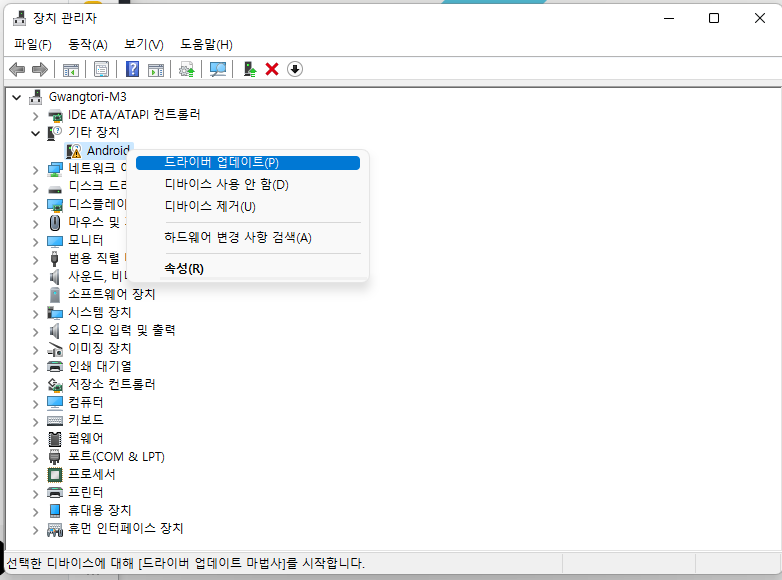 장치 관리자로 이동해서 기타 장치 > Android를 마우스 우클릭하고, 드라이버 업데이트를 눌러줍니다.