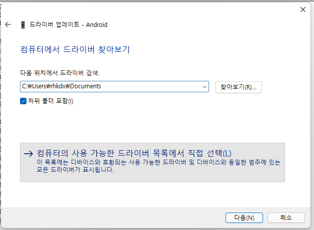 컴퓨터의 사용 가능한 드라이버 목록에서 직접 선택을 눌러주세요.