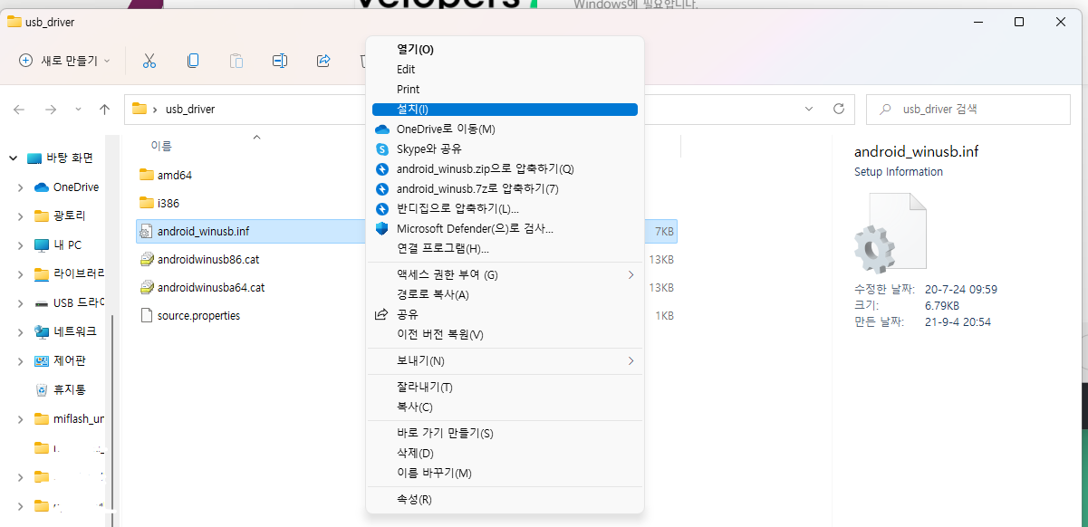 android_winusb.inf 를 우클릭한 후, 설치를 눌러줍니다.